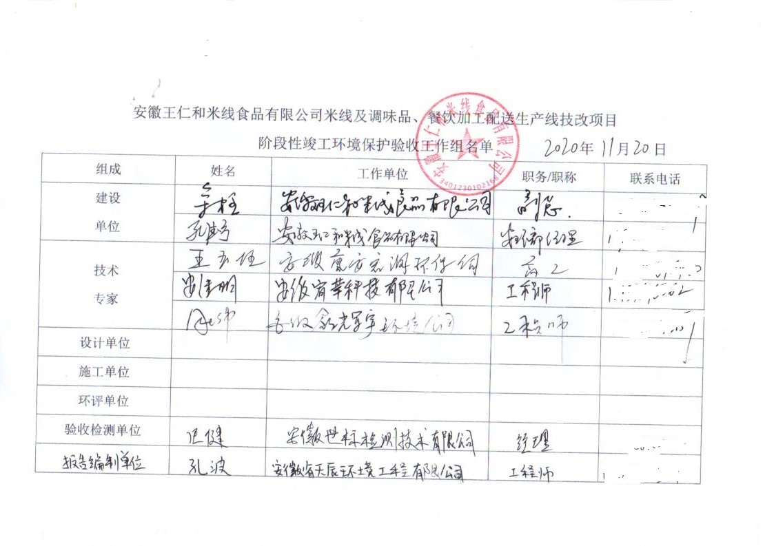 安徽王仁和米線食品有限公司米線及調(diào)味品、餐飲加工配送生產(chǎn)線技改項目階段性竣工環(huán)境保護(hù)驗收報告公示
