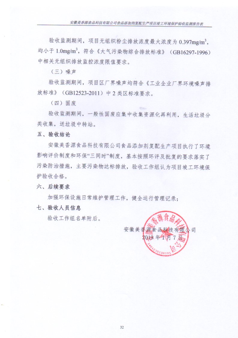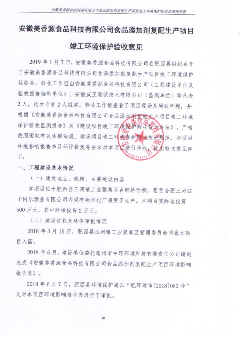 根據《國務院關于修改〈建設項目竣工環境保護管理條例〉的決定》(國務院令第682號),以及環保部《關于發布<建設項目竣工環境保護驗收暫行辦法>的公告》(國環規環評[2017]4號),現將安徽美香源食品科技有限公司食品添加劑復配生產項目竣工環境保護驗收內容公式如下: